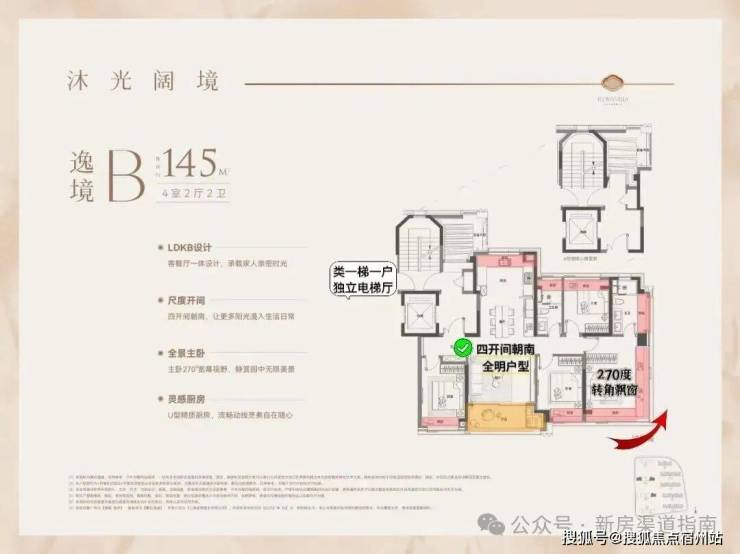 这个户型全部是 类一梯一户独立电梯厅 设计。 四开间朝南+南北通透+全明户型+270度大飘窗, 改善户型的终极之作!无论是四口之家还是三代同堂,尺度都能完全容纳。