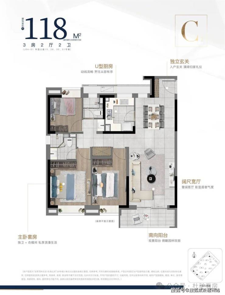 建筑面积约100㎡/118㎡三房两厅两卫, 三口之家/三代同堂从容满足,南北通透外,餐客一体,动静分离居住舒适度更高,三开间朝南,三房全飘窗,日常在阳台上饲花弄草,生活将被赋予高仪式感。
