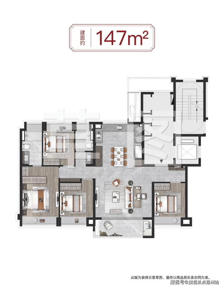 约147㎡4房2卫户型类一梯一户的居住体验,业主能独享一整个电梯厅,私密性相当高。