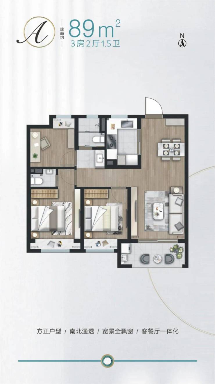 建面约89㎡3房,户型方正,三开间朝南。餐客厅一体,连通阳台,采光通风俱佳。全卧飘窗,主卧套房设计,提升了舒适度。1.5卫设计更加人性化,便于使用。