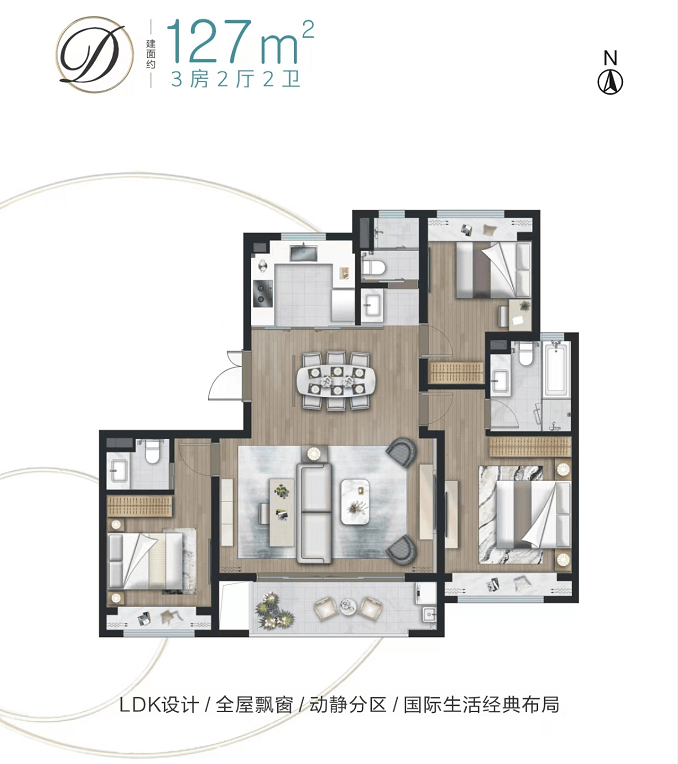 建面约127㎡3房,飞机户型,动静分区。双套房设计,私密性舒适性俱佳。客厅预留灵动空间,可作为书房、儿童活动区使用。