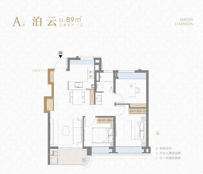①建面约89㎡3房2厅1卫户型:
