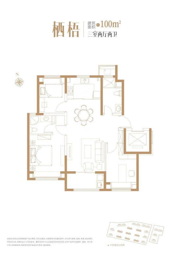 建面约100㎡户型3室2厅2卫▼