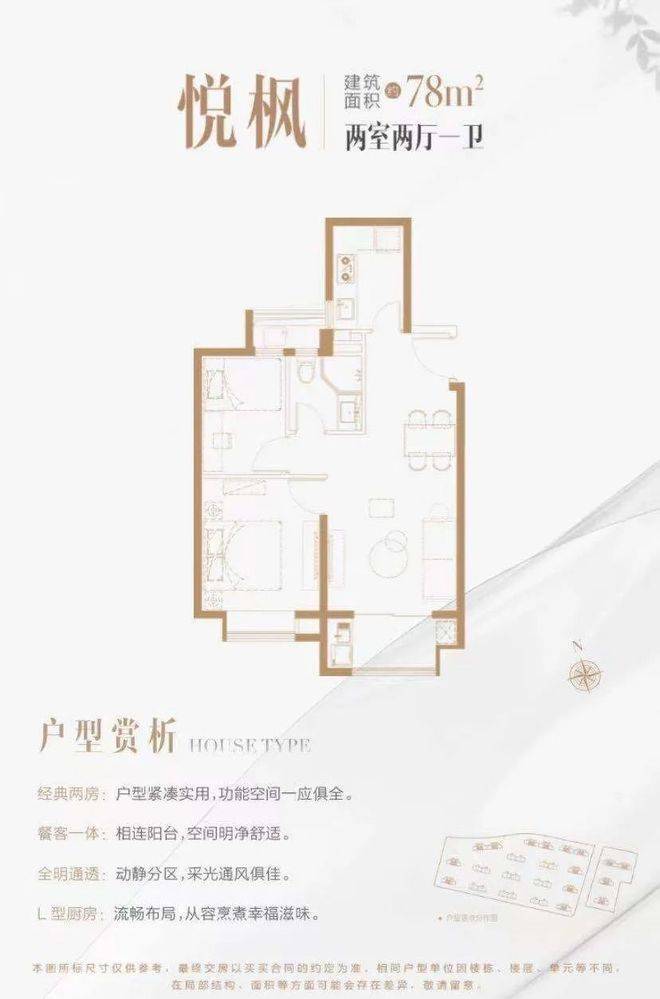 建面约78㎡户型2室1厅1卫▼