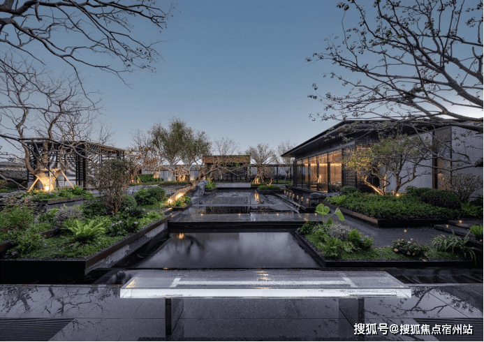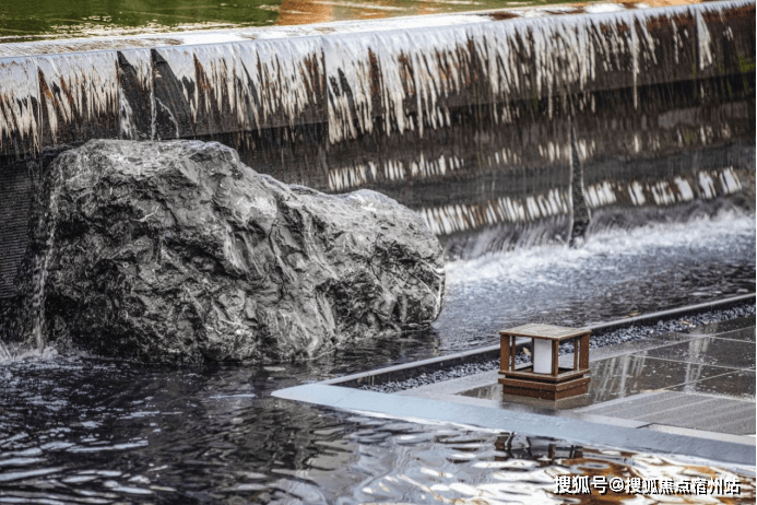 又比如,项目延续了张园“引水入园”的理念, 将长200m近1000m²的水系覆盖到整个社区内。 水景形态各异,有中心静水、三层跌水、点状涌泉、立面叠瀑、弧形流水五大不同呈现方式。水系的引入,让整个社区彻底灵动飘逸了起来。