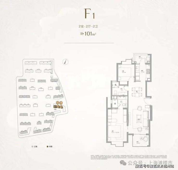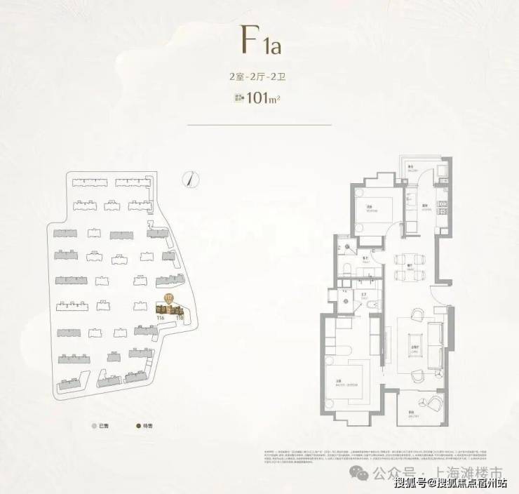 其中建面约101㎡2房2卫,总价预计千万以内,主卧套房不仅拥有独卫,还有步入式的衣帽柜,也可以设计一个梳妆台,尺度感不输市面上120㎡户型的主卧;南北双阳台,彻底告别了传统单阳台在功能上的纠结与妥协,从客厅望出去不再有衣物遮挡光线和视野。