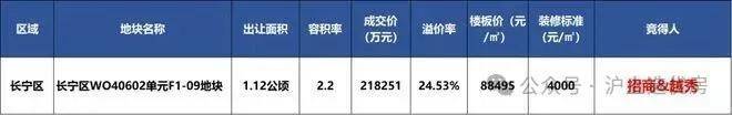 2024年第八批次土拍首日,招商&越秀以总价21.82亿元竞得长宁区仙霞社区地块(长宁区W040602单元F1-09地块)。溢价率24.54%拿下。折合楼板价88495元/㎡,装修标准4000/㎡。