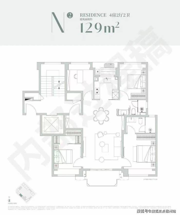 建面约129㎡4房2厅2卫:一梯两户,层高3.05米,三开间朝南,全卧飘窗,LDK一体化设计,南北直通,南向整体面宽约11.1米,其中客厅面宽约4.4米,主卧面宽约8.6米!