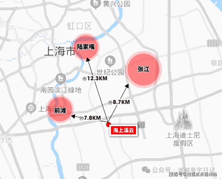 海上溪云距离中环线直线约3km;距离前滩直线约7.8km;距离张江直线约8.7km;