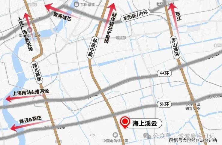除此之外,海上溪云还能通过外环+中环去徐汇漕河泾、闵行莘庄以及大虹桥徐泾;通过南北高架直达人民广场等浦西城芯。