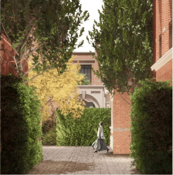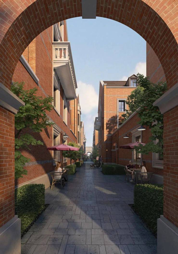 风貌里弄浓缩了中西合璧的石库门文化,采用原汁原味的红色陶砖镶嵌灰砖再现传统墙面。巷道尺度关系亲密而不拥挤,承载着海派生活的高级烟火气。里弄建筑从地块的历史信息出发,选择了三角形山花、弧形山花两款最为经典的石库门做法,采用保加利亚进口沉香米黄石材干挂工艺,整石荒料雕刻,线条流畅饱满,奠定高雅大气的建筑底蕴。