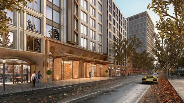 项目的风貌高层保留了古典建筑的三段式立面,基座的连续拱券以及头部的柱头,无疑是历史留下的印迹。而当代材料工艺的引进,则让建筑的美有了更丰富的层次。在高层的底层商业部分,项目选用了来自巴西的奢石波多尔红,搭配高难度的双曲面工艺,呈现出独特的优雅与魅力。商业以上的建筑立面,用巴西进口玫瑰金麻造型石材搭配局部铝板及金属线条,强化了现代感,传递出新旧交融的气质。