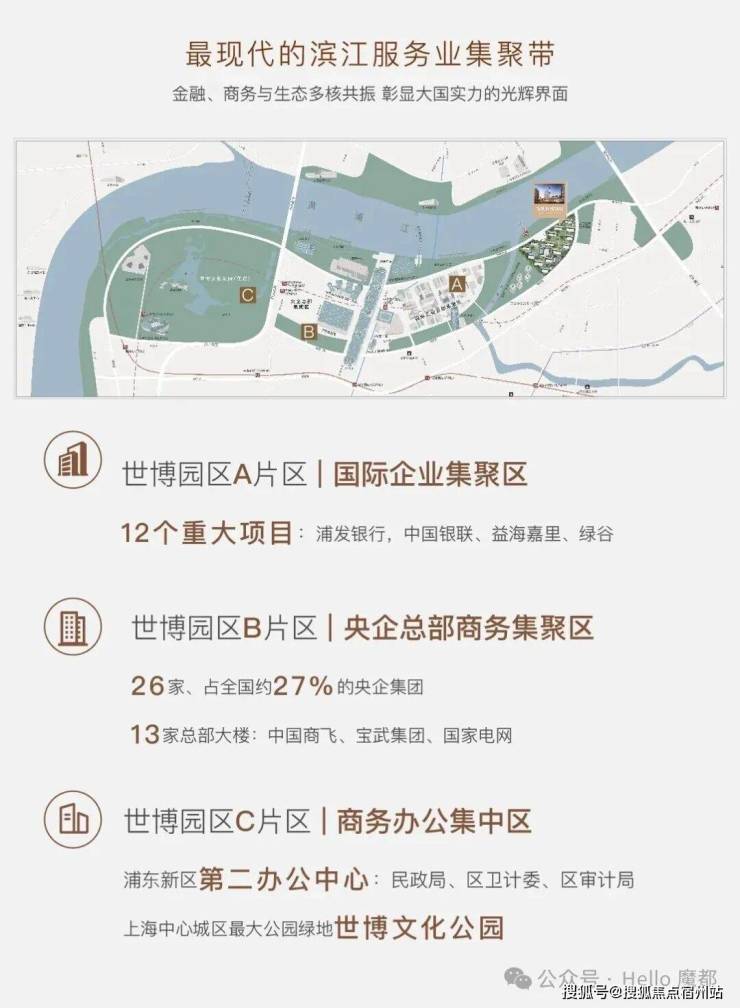 B片区为国内央企最密集地区,约27%的央企集团(26家)落户世博,包括中国宝武一级总部、中国商飞一级总部、中核上海总部、中国电力投资集团等。