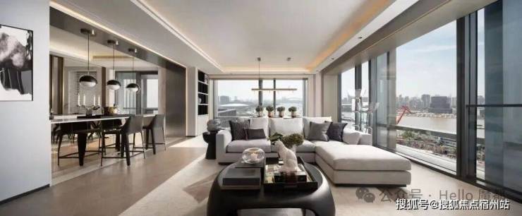 这客厅既是 270°全景舱厅 ,无论全家在餐桌前欢聚一堂,还是孩子们在客厅嬉戏,一抬头便是以江景和城市为主题的巨幅油画。