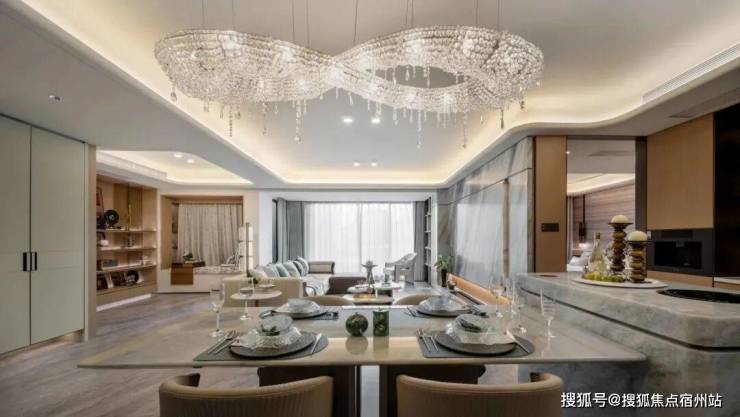 LDK一体化空间是家庭互动的主场, 客厅与餐厅贯通形成约40㎡敞阔区域,孩子在地毯上搭积木,父母在中岛台准备早餐,视线交汇间满是烟火气。