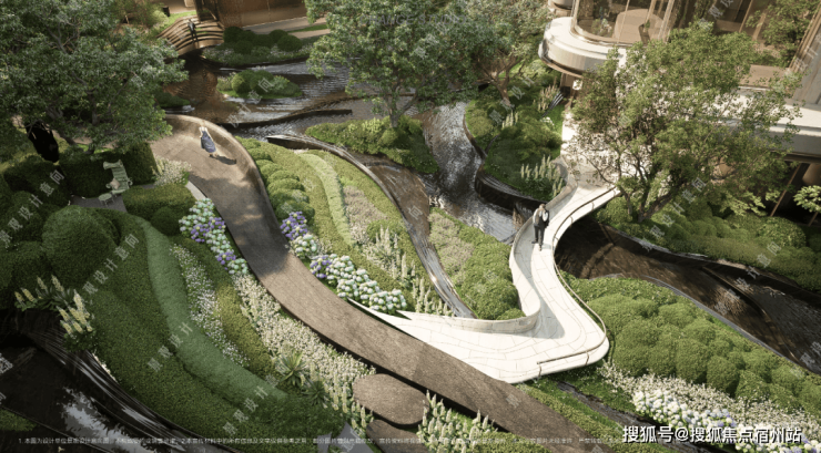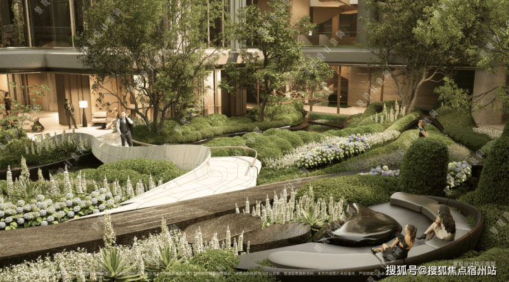 抬板后形成的“新地面层”通过下沉庭院、空中花园等多维绿化系统,使景观从地面向空中渗透。