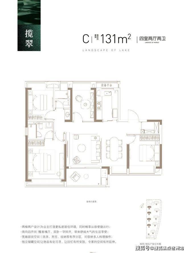 建面约131㎡4房2厅2卫,✅✅大家映翠府售楼处电话:400 - 8824 - 258✅✅两梯两户设计,给足了业主归家仪式感和尊崇感,同时拥有一个尺度阔绰的入户门厅作为自己家的延伸!