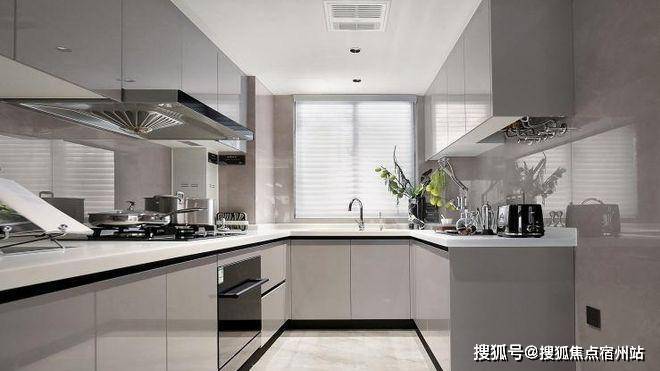 厨房空间,采用铝合金玻璃PVC饰面免漆门套及铝合金移门✅✅大家映翠府售楼处电话:400 - 8824 - 258✅✅三件套使用老板的油烟机、燃气灶、洗碗机交付,更有摩恩的水槽和龙头、定制的组合橱柜。