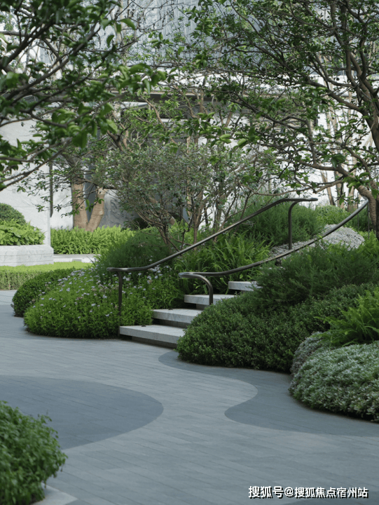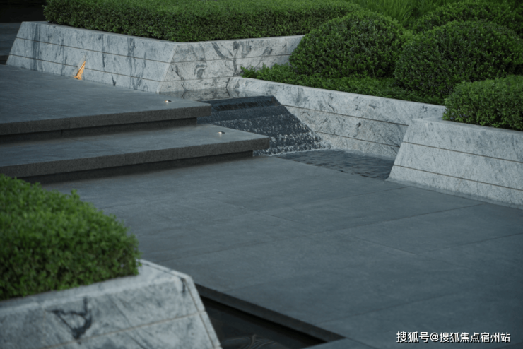 花池与水台的交界近景,借由地形高差,让水景与绿植形成丰富层次,以现代手法将自然意趣浓缩于一方天地,两种质感、深浅的体块嵌合之美,涌泉隐没在体块间,在日常风景里增加一点诗意的氛围。