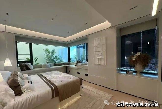 主卧背景墙更以威尼斯安缦酒店同款树瘤木,搭配巴黎宝格丽酒店同源羊皮纸,将全球顶奢酒店的居住质感搬进家中,每一处选材都彰显塔尖人居的高奢基因!