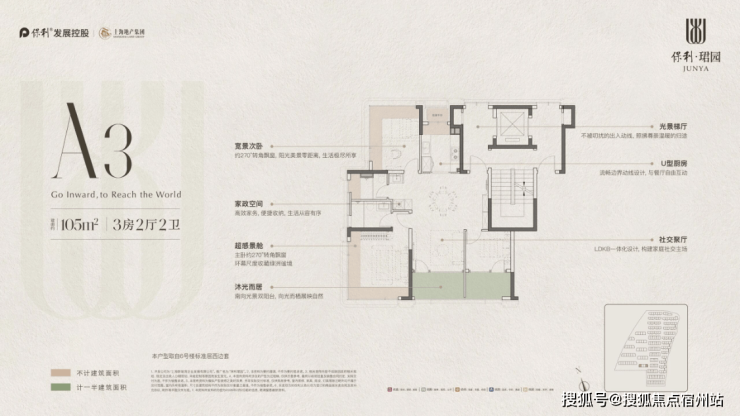 建面约 105㎡三房两厅两卫 :三开间朝南,南北通透,约 6.5 米宽景阳台连接客厅与次卧,主卧套房设计,配备独立卫浴与衣帽间,LDK 一体化设计,空间利用率高,全明通透,是首改家庭的理想选择。