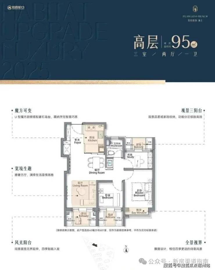 再加上南向大面宽短进深、全卧飘窗、L型转角阳台设计,哪怕小户型95㎡3房,尺度感都超棒,采光和视野更是一流。