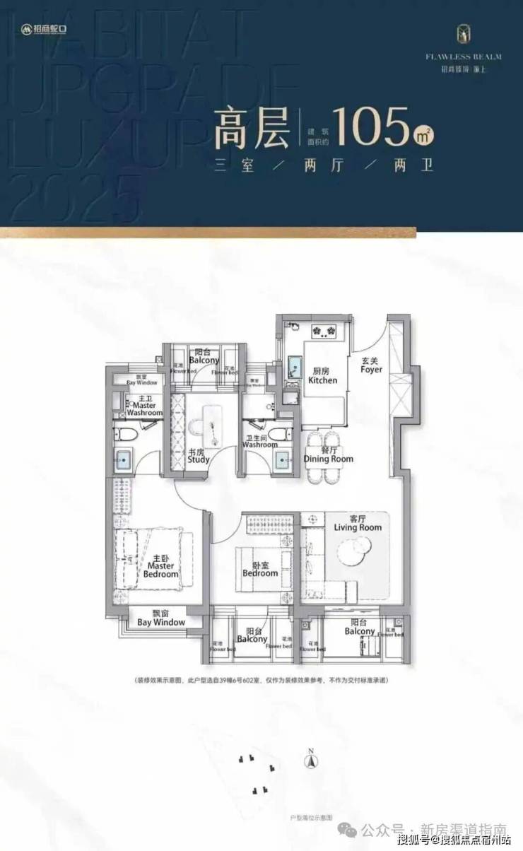 建筑面积约105㎡三房,进阶改善绝版“三阳台”户型,主力总价段约700万级,部分房源总价约650万级。