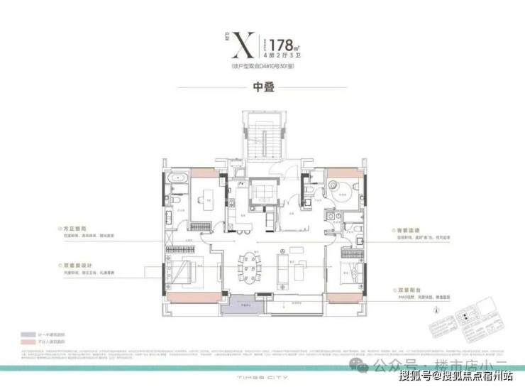 【奢阔墅境】:中平、上叠,南向双阳台链接奢阔横厅,延展空间尺度与奢居体验;双套房设计,为居者构筑互不干扰的私属领域,主卧全景飘窗,无论晨曦初照还是繁星夜幕,都能享受到无与伦比的视觉盛宴。
