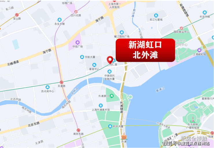 上海市虹口区北外滩板块,据守上海繁华 之巅,1公里内享受城市最顶级生活配套。 坐落于天潼路以北,武昌路以南,吴淞路 以东,乍浦路以西。