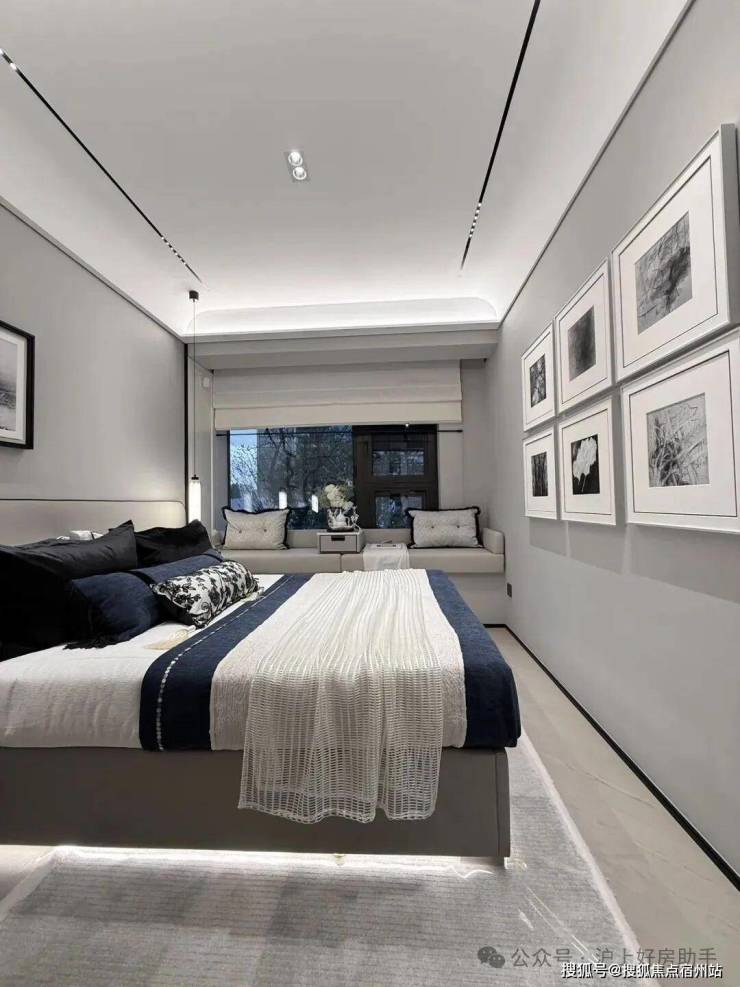 南次卧也是套间设计,而且也是明卫,设计上还是用了心思的。卧室部分净面宽约2.9m、进深约3.7m。根据测算,可以放置6尺的床(宽度约1.8m)+2个床头柜(宽度约45cm/个)+衣柜(深约60cm)是可以的。