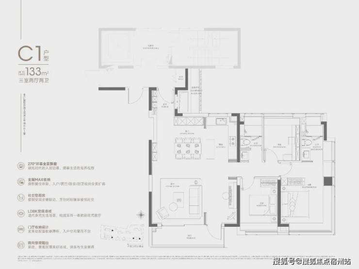☑️☑️华润中环置地中心望云售楼处电话:400-1183-605☑️☑️133㎡可以说是108㎡的进阶款,同样的三房两厅两卫,大面宽横厅、半开放式厨房设置岛台,加上主卧L型飘窗,再一次验证了华润置地豪宅化的产品思路。