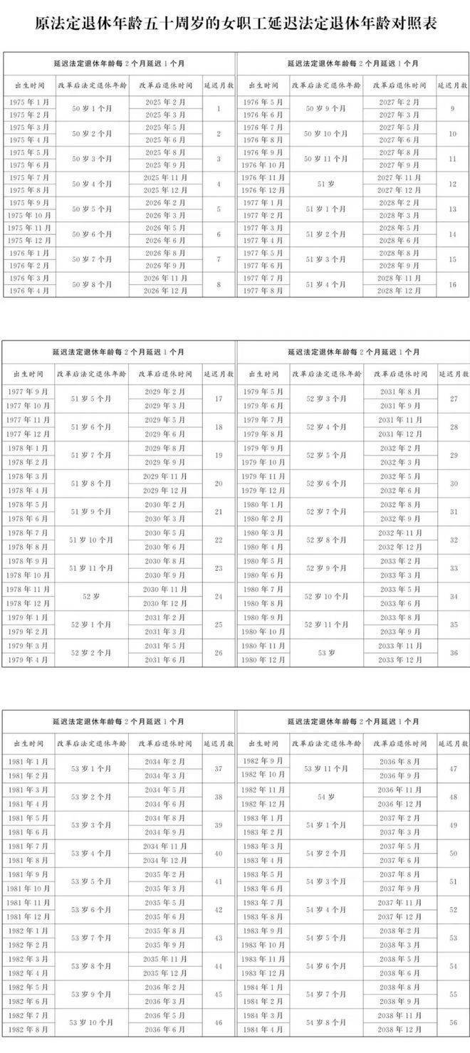 2025年1月1日起,原法定退休年龄为60周岁的男职工和原法定退休年龄为55周岁管理、技术岗位的女职工,法定退休年龄每四个月延迟一个月,分别逐步延迟至63周岁和58周岁;原法定退休年龄为50周岁工人岗位的女职工(不包括事业单位在编的干部身份的女职工),法定退休年龄每二个月延迟一个月,逐步延迟至55周岁。