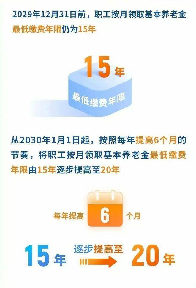(2029年12月31日前,职工按月领取基本养老金最低缴费年限扔为15年,2030年1月1日起,最低缴费年限每年提高六个月,由15年逐步提高至20年。)