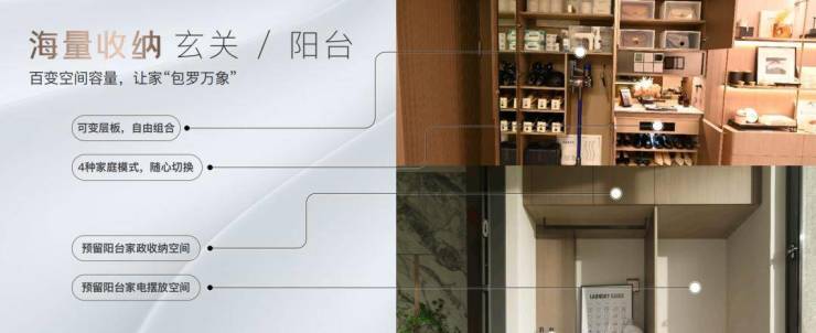 光合上城不仅打造定制级全屋收纳系统,并且从玄关、厨房、卫浴、阳台四大空间,充分考量生活场景细节,随时随地满足收纳所需,带来4重海纳系统,让每一个业主都成为空间管理大师!