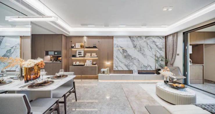 精选钢木复合门、臻选雅艺壁布、自然木饰面、全景一体化岩板背景墙等精奢材质,搭配充满仪式感的氛围灯带、打磨移门、踢脚线、过门石等每一处细节。