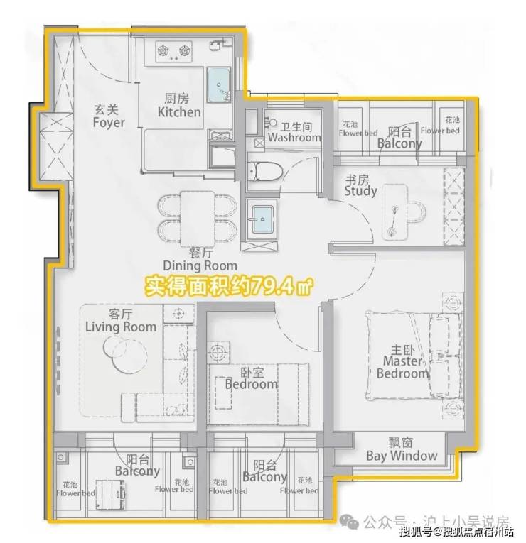 三万平方看到本次公布的户型着实被惊到了, 招商臻境源上的建面约95平的已经不满足三个阳台的豪华配置了首创在阳台两侧加了花池 ,颇有第四代住宅的意思。