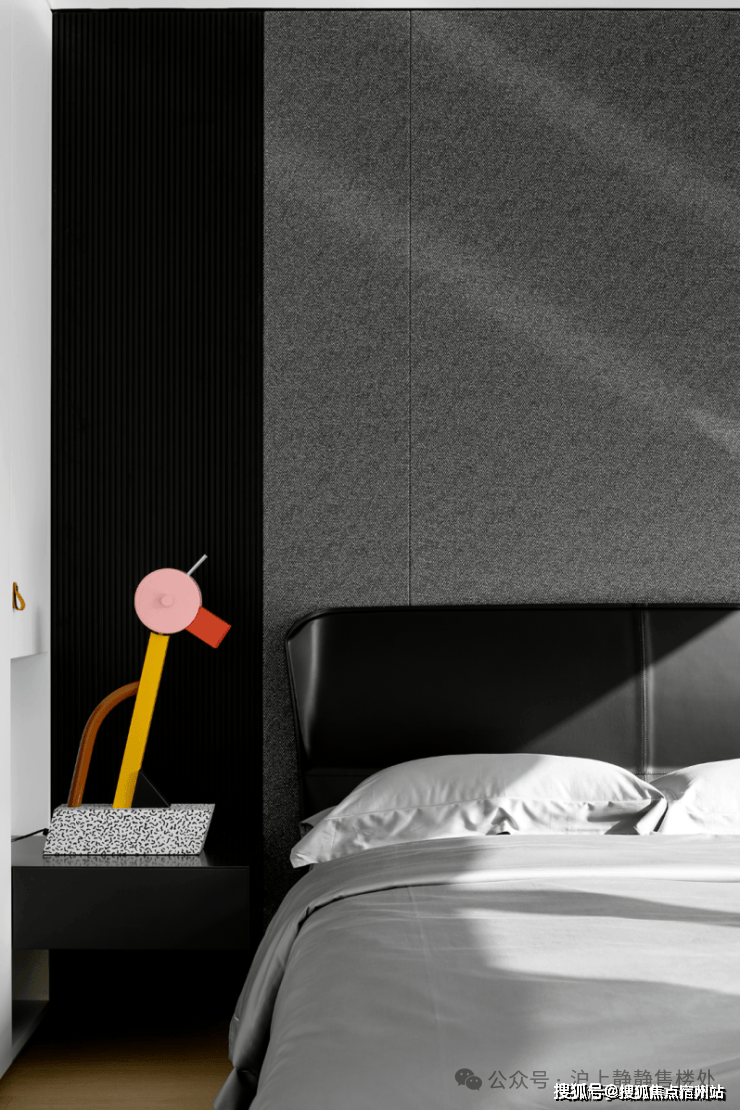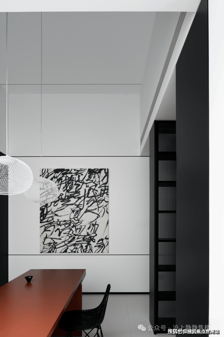 私密场域依旧保持静谧,黑白色基础上搭配了更多的色彩,例如深棕、浅紫等,艺术品的衬托深邃迷人,热络了家的氛围。