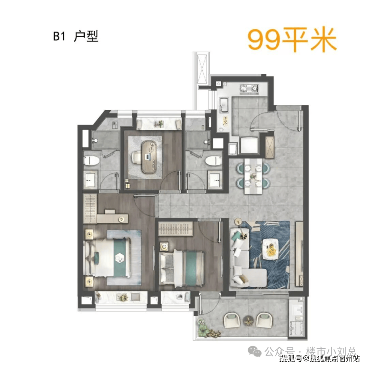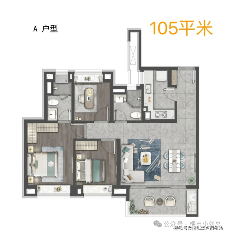 以 99㎡三房两厅两卫户型为例,客餐厅连接景观阳台,采光面更大,为日常生活带来更多舒适感,双卫设计更为生活增添便利。105㎡三房两厅两卫户型,客餐厅与阳台一脉相连,居住空间感进一步扩大,约 5.1 米的宽厅,无论是日常休憩还是会客,都尽显大方得体。此外,项目中央空调、地暖、新风三大件配套齐全,且臻选大金等同级品牌空调地暖、老板和方太等同级品牌厨房配备、摩恩、弗兰卡、科勒等同级品牌卫浴配备 ,每一处细节都彰显着对居者的用心,为您打造高品质的居住环境。