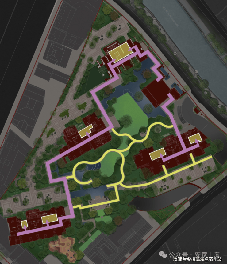 社区 约3000㎡的中心花园和6大艺术花园 ,不仅让每栋楼都享受“楼王”的待遇,且自然勾勒出一条漫游式的公园归家动线(黄色线条走向)