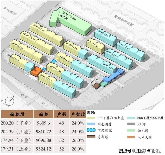 该地块拟建设13栋4F叠加别墅,有4个主力户型,包括建面约178㎡上、下叠,建面约200㎡上、下叠。其中,建面约178㎡上下叠主要分布在地块西侧,建面约200㎡上下叠主要分布在地块东侧。