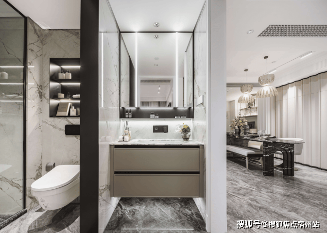 卫浴台下盆、墙出水龙头、壁挂式智能坐便器、恒温花洒采用德国唯宝品牌,日立卫生间空调,高奢品牌的加持,赋予奢适生活体验的跃级。