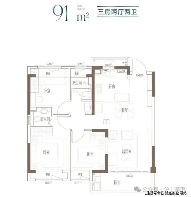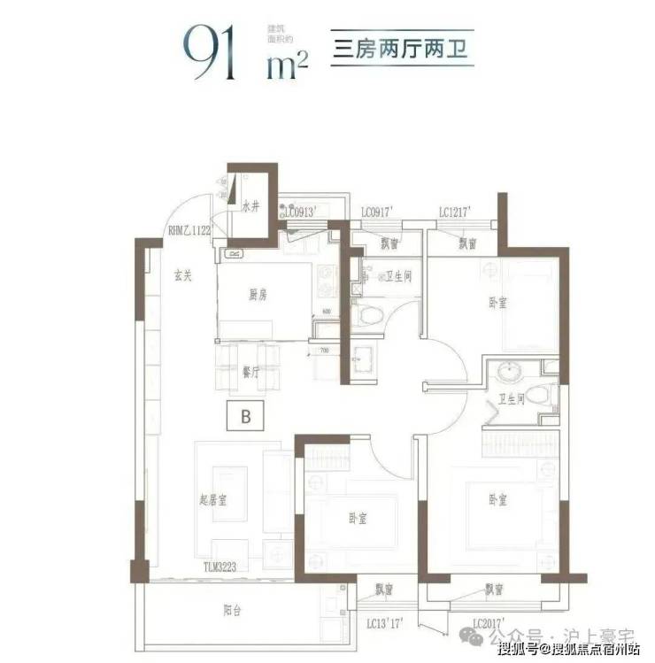 建面约91㎡3房2卫,三开间朝南,客餐厅连通大阳台, 四飘窗设计,好户型该有的素质它都有。