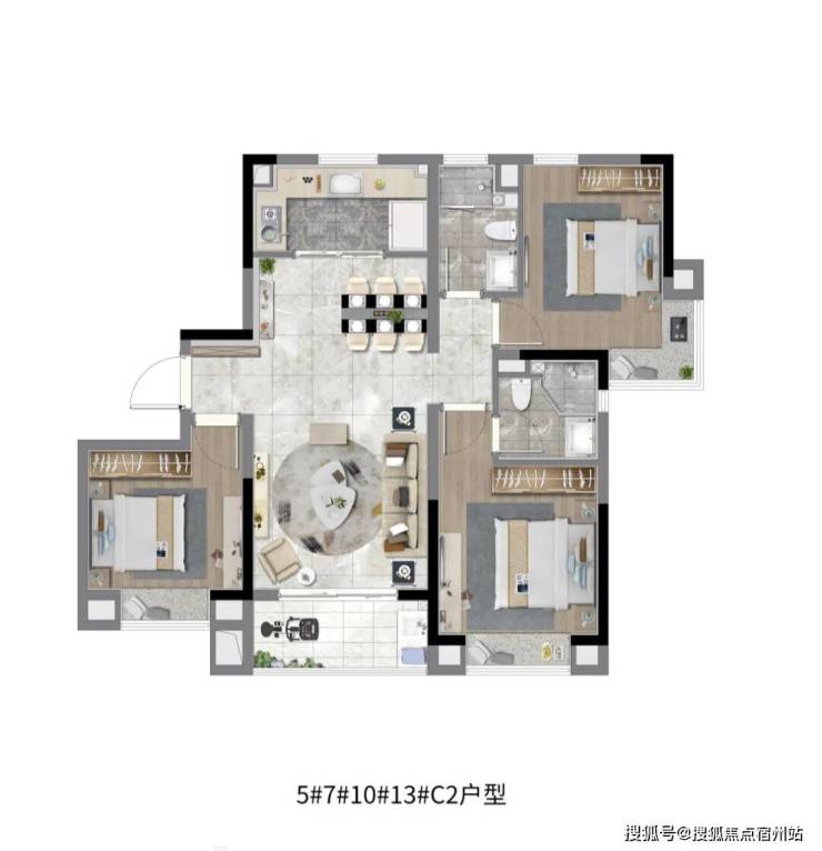 建面约110-129㎡三房两厅两卫,针对改善型刚需家庭打造,阔绰尺度,彰显舒适感与尊崇感;南北通厅设计,采光通风效果极佳,空间通透开阔,私密性强,家人之间互不干扰;双卫生间设计,避免早晚高峰期排队等待的尴尬,兼顾实用性与舒适度,适合多孩家庭或与老人同住的家庭;主卧套房设计,配备独立卫浴和衣帽间,兼顾私密性与尊崇感,让主人拥有专属的舒适空间;次卧均为南向设计,配备飘窗,居住舒适度极高;客厅连接超大南向阳台,推窗即可望见社区园林与古镇风光,享受自然与生活的诗意交融;厨房U型设计,操作空间充足,满足日常烹饪需求,让家人在烟火气中感受生活的美好。