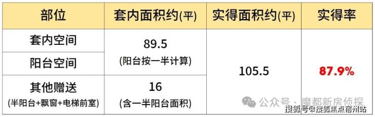 该户型大量的飘窗+双阳台设计,保证了每个功能间的通风采光,也提升了户型的实得率。经过专业建筑师测算,假设阳台全部封闭的情况下,项目建面约120㎡户型实得面积约105.5㎡, 实得率约88%。 (该实得率数据根据实得面积预估计算所得,仅供参考,不作为置业依据。最终得房率以购房合同为准)