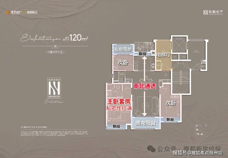 项目建面约120㎡户型也是 类独立电梯厅 的设计,室内则是标准的 南北通透+三开间朝南设计 ;主卧套房配置,自带卫生间,私密性和舒适度俱佳。