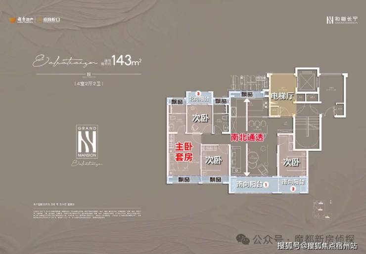 项目建面约143㎡户型的设计无疑是市场一流水准, 一梯一户 保证私密性和尊崇感;四开间朝南+大宽厅,采光效果爆棚;主卧贯穿南北套房设计,南北都有飘窗,舒适度可圈可点。