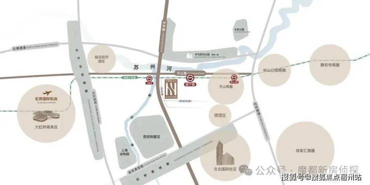 【地铁2号线】直线距离威宁路站约800m, 北新泾站约200m,东向2站中山公园,4站静安寺,6站人广,9站陆家嘴,直抵浦东国际机场,西向3站虹桥2号航站楼,4站虹桥火车站,是上海名副其实的国际线。