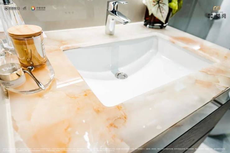 台盘、龙头为高仪(或同等档次)、马桶为高仪智能马桶(或同等档次)。洗手台采用大面积岩板匠心打造,搭配精奢玉石台面,彰显细致入微的质感,到顶的一字型玻璃屏移门,多功能金属包边美妆镜柜,简约大气的顶喷恒温花洒,风暖浴霸、电热毛巾架……无处不是诚意满满的用心。