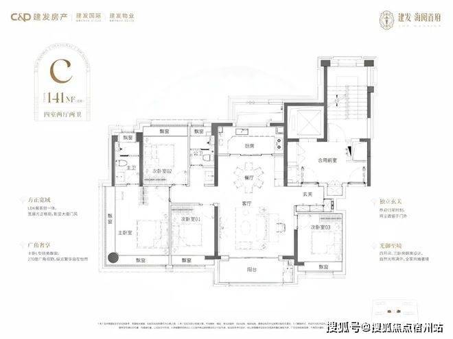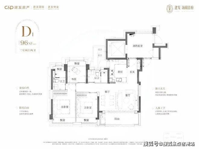 建面约103㎡3房户型:比起市面上普遍的三开间朝南动静分区户型,建发·海阅首府该户型至少有3大爆点: