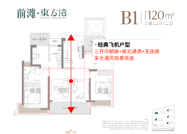 建面约120㎡3房2厅2卫,做到了 3开间朝南+双阳台+主卧套房设计+270°转角飘窗 ,居住体验、舒适度、尺度感倍增。